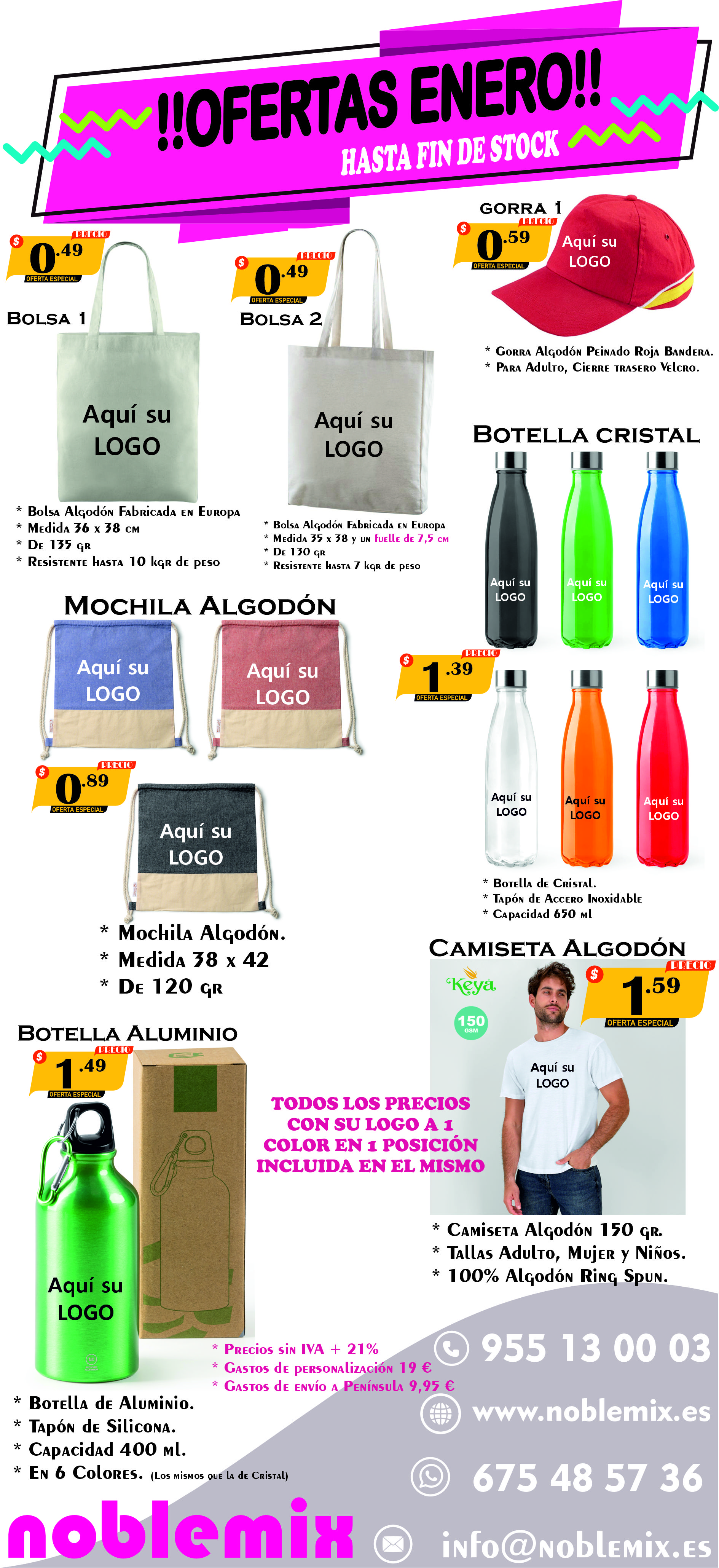 T-shirts e mochilas de algodão com o seu logótipo por 1,59€ ou 0,89€